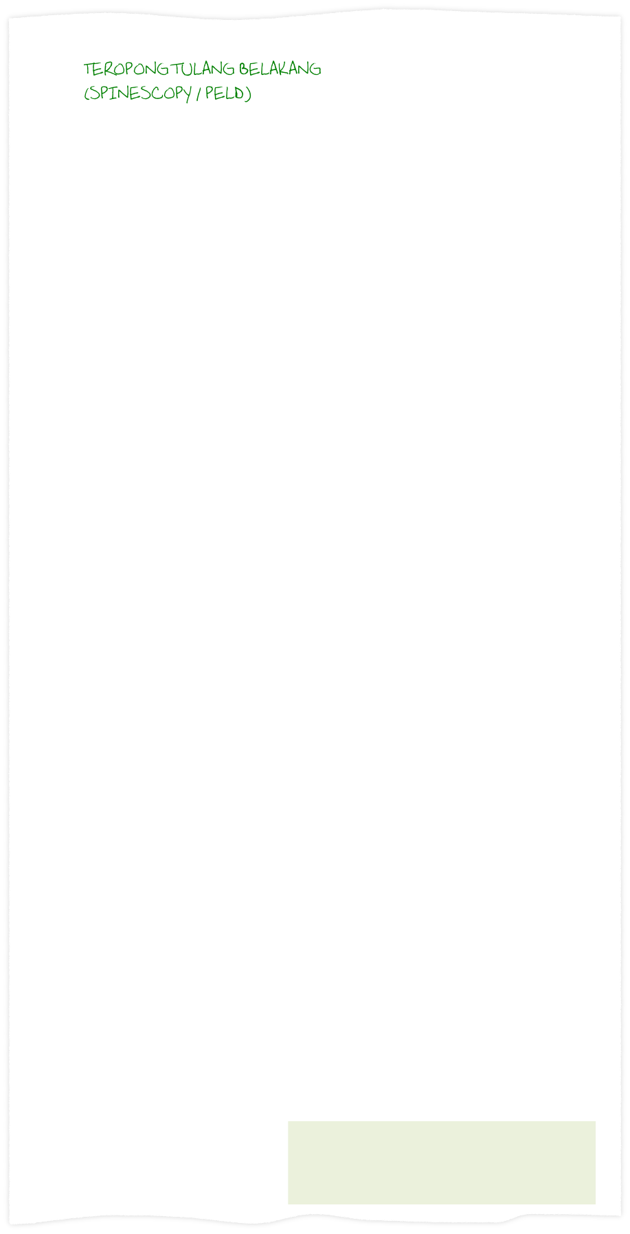 Teropong tulang belakang (Spinescopy/Endoskopic Spine Surgery) adalah suatu prosedur tindakan untuk melihat dan memperbaiki kondisi tertentu tulang belakang melalui irisan lubang kecil (± 1 cm) pada kulit. Tindakan teropong tulang belakang dapat digunakan untuk beberapa kasus problem tulang belakang seperti jepitan saraf tulang belakang dan penyempitan rongga saraf tulang belakang yang masih bersifat terlokalisir.